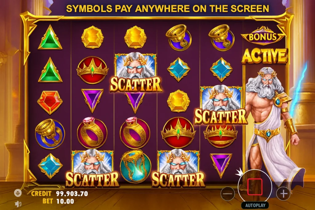 Необходимо собрать минимум 4 scatter-символа (Зевс) или активировать фриспины вручную за 100x от ставки.